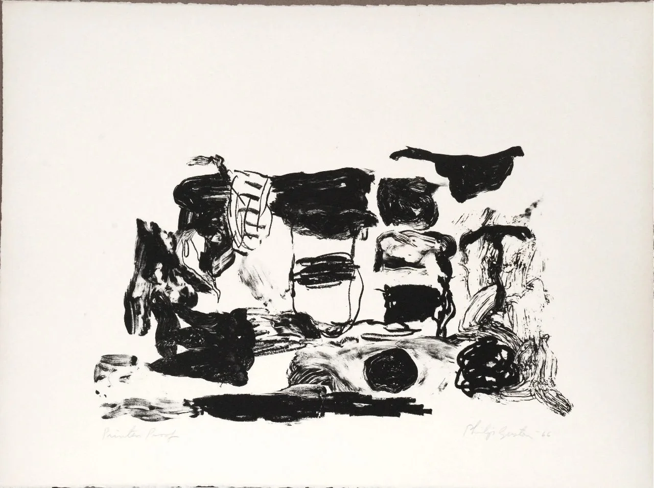 Philip Guston collaborated with master printer Irwin Hollander to produce a series of innovative prints that expanded upon his distinctive style as a painter. Known for his bold and figurative compositions, Guston's prints created with Hollander often showcased his exploration of existential themes, political satire, and personal introspection. Their partnership allowed Guston to experiment with various printmaking techniques, including lithography and etching, translating his provocative imagery into the realm of graphic art with meticulous craftsmanship. Guston and Hollander's collaboration produced prints that continue to resonate for their blend of artistic integrity and technical excellence, contributing significantly to Guston's legacy as a seminal figure in contemporary art.